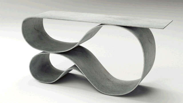 浸透了混凝土的织物在水合作用时会变硬,从而形成纤薄、耐用、防水耐火的混凝土层。这种独特的铸造和成型技术实现了桌子绝妙的带状结构。