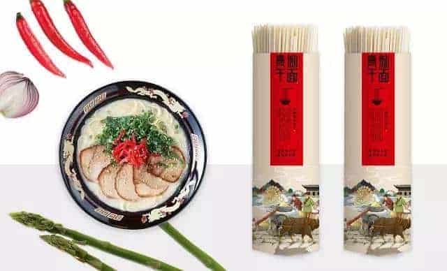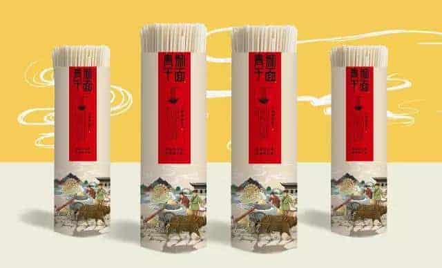青城干面的包装展示了一幅农耕景象,勤劳的农夫,远处的山城景色,很有地方特色。