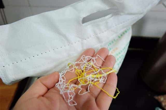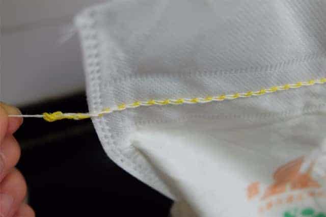 看吧,两根完整的封口线就在手里了,拆面粉袋是不是很简单呢。记住这个小口诀:面粉袋,朝自己,是双线,左边拆,是单线,右边拆,一手一根线,轻轻松松把袋拆。是不是很好记呢!不仅是面粉袋,所有的封口线都是这样的哦。