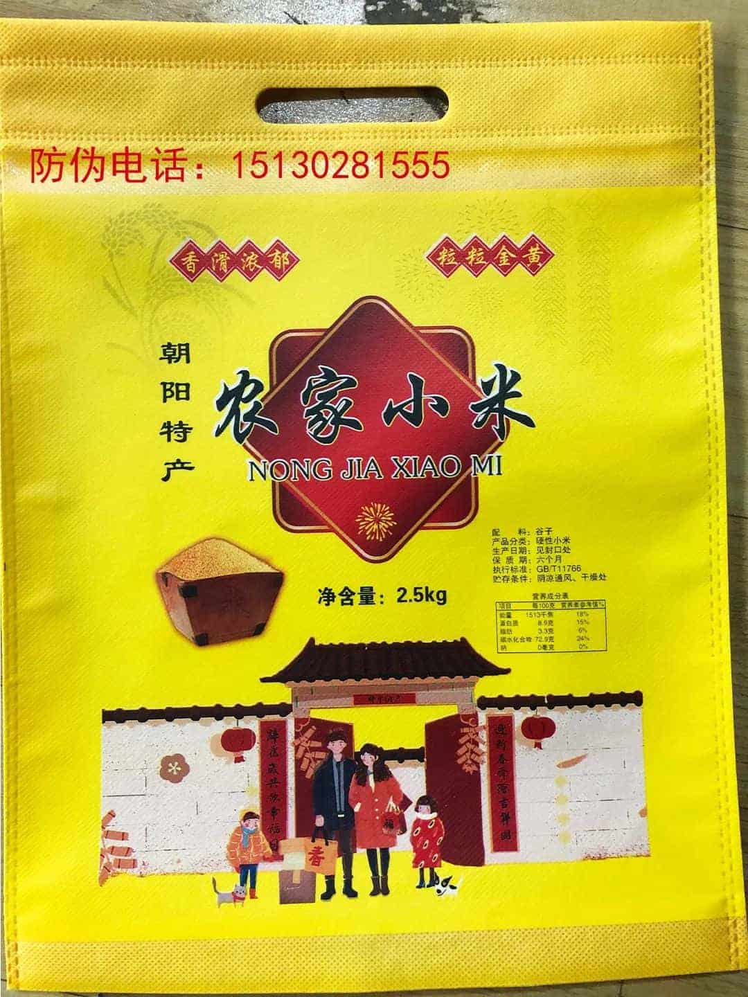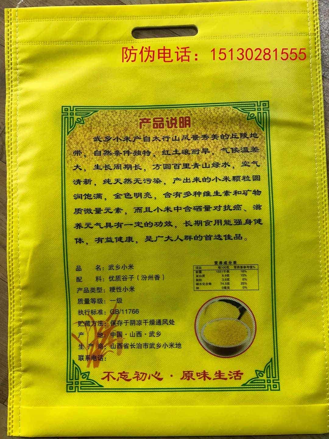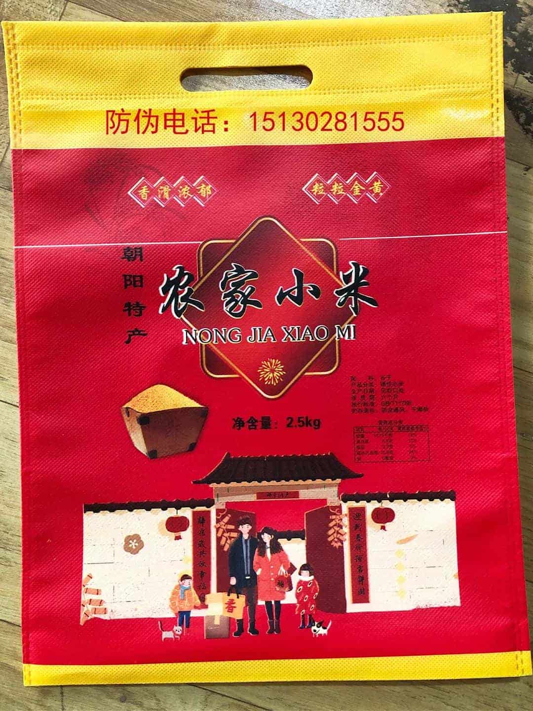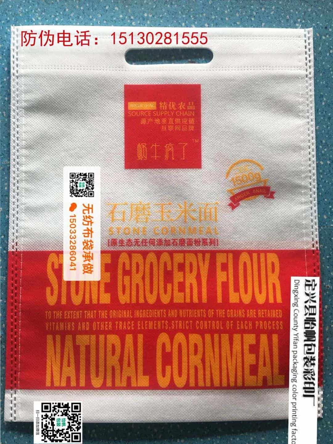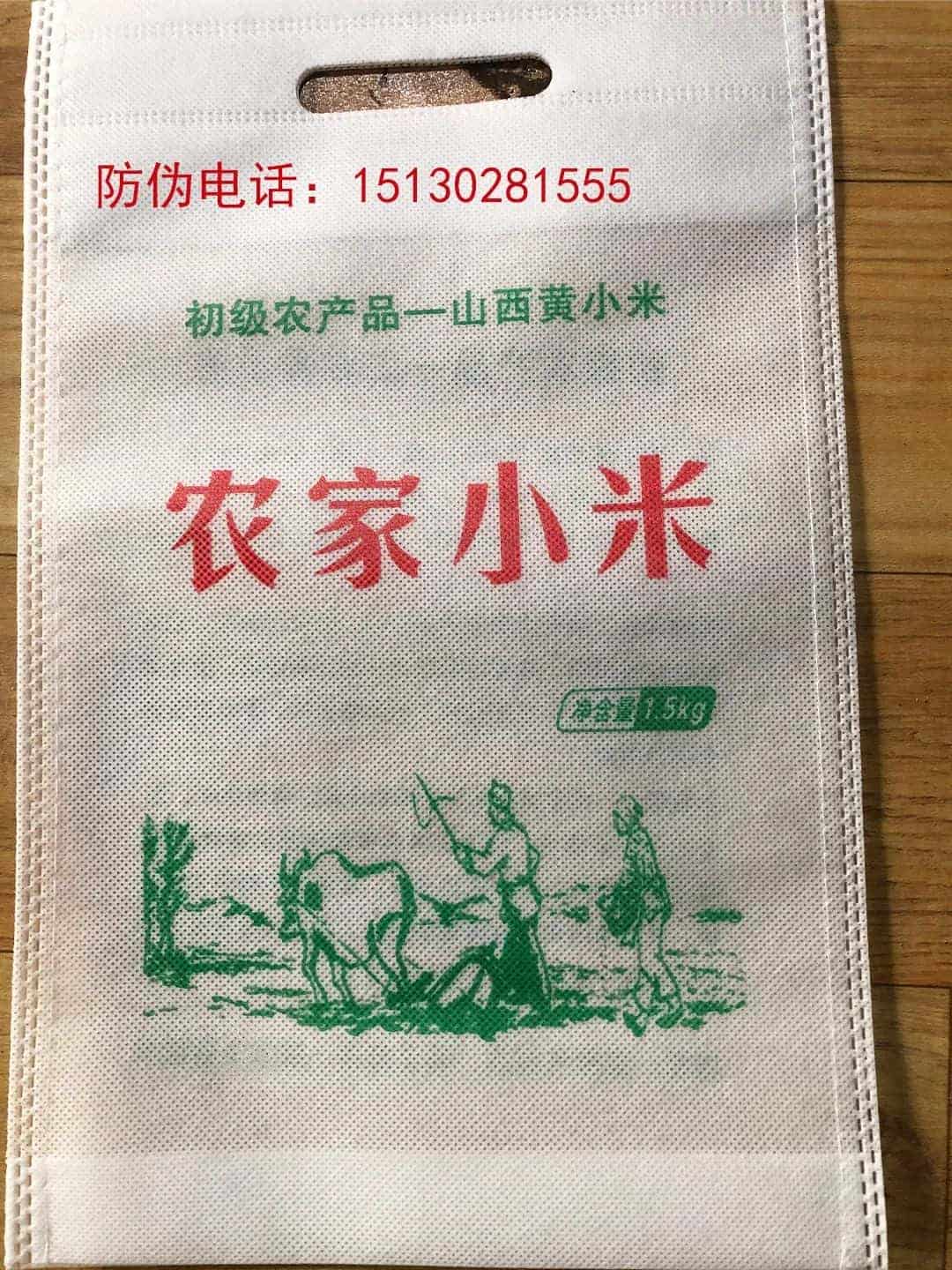 厂家主营产品:无纺布面粉包装袋,无纺布大米包装袋,小米袋,无纺布杂粮袋,无纺布手提袋,无纺布广告袋等无纺布袋系列产品。无纺布面粉袋包装规格有500克,1000克,2.5公斤,3公斤,5公斤,10公斤等,特殊 规格可以来电定做。