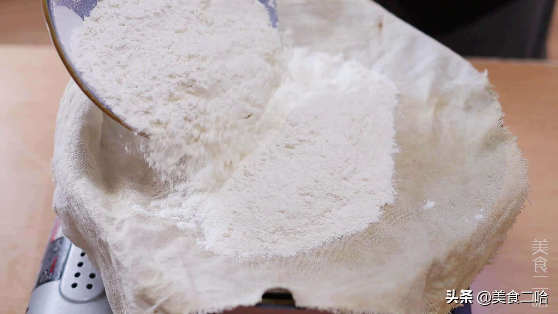 2)把普通面粉放在蒸屉上,蒸屉提前要用干燥的笼布铺上,然后在面粉表面戳几个小洞洞,上面再覆盖上干燥的笼布,水开后小火蒸20-30分钟,然后用擀面杖压碎,晾干过筛就是低筋面粉。