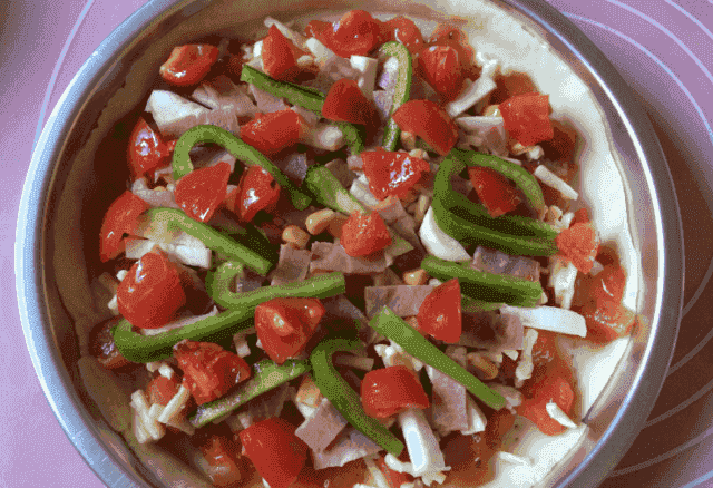 第四步:如果喜欢吃蔬菜,还可以多备一些蔬菜,这样吃起来更香。面团发好之后擀成8寸的披萨盘大小,然后用叉子戳一些小孔,接着抹上一层西红柿酱,撒上准备好的蔬菜和奶酪,接着倒入切好的培根,最后将剩余的奶酪、西红柿将全倒入披萨饼上都可以了。把披萨放入烤箱蒸15分钟左右就可以了!