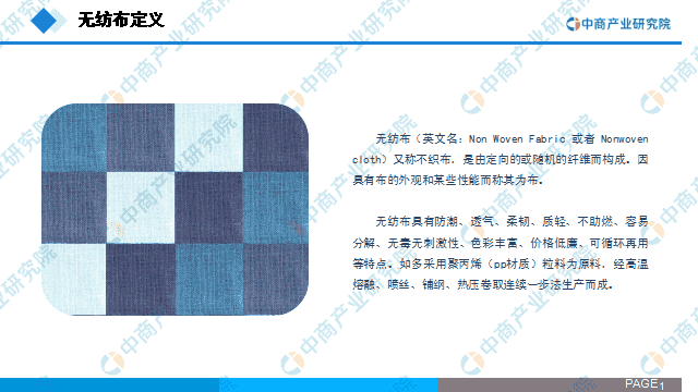 无纺布生产技术不同于传统的纺织技术, 在纺织过程中不需要进行纺纱的过程, 其纺织技术类似于造纸技术, 又称非织造布。无纺布具有环保、透气、质轻、防潮、耐久等很多现代意义的特点, 并且广泛应用于一次性用品、无纺布拼图、精装面粉袋等。未来,中国无纺布市场逐渐扩大,预测2025年中国无纺布市场规模将近900亿元。