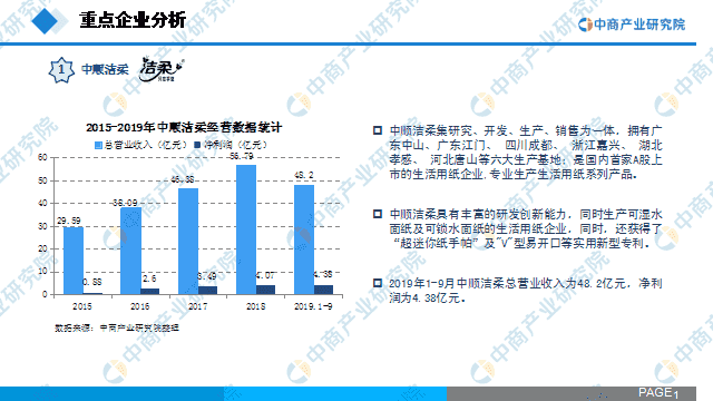 中顺洁柔集研究、开发、生产、销售为一体,拥有广东中山、广东江门、 四川成都、 浙江嘉兴、 湖北孝感、 河北唐山等六大生产基地;是国内首家A股上市的生活用纸企业,专业生产生活用纸系列产品。中顺洁柔具有丰富的研发创新能力,同时生产可湿水面纸及可锁水面纸的生活用纸企业,同时,还获得了“超迷你纸手帕”及"V"型易开口等实用新型专利。2019年1-9月中顺洁柔总营业收入为48.2亿元,净利润为4.38亿元。