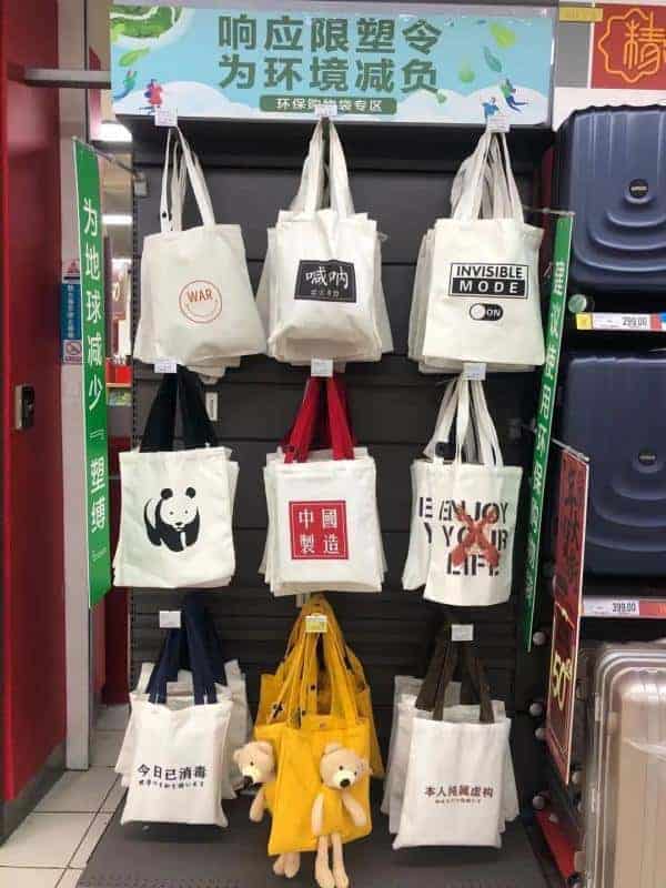 店长张瑞卿告诉记者,对于没带购物袋的消费者,他们也提供了多种选择: “我们有环保袋可重复使用,目前是4块9一个;还有10个种类的帆布袋,价格19.9元起;有些老年顾客可能觉得太贵了,我们在服务中心也免费提供给他纸箱,买完之后可以到服务中心去打包。”