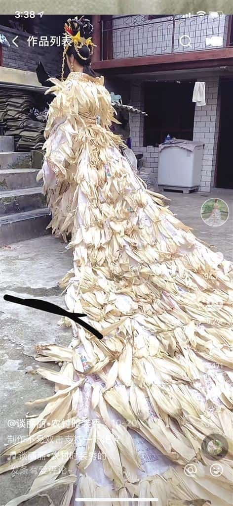 在谈丽丽的快手账号,播放量最高的视频超过3200万次。这是一款用玉米叶制作的“凤袍”,用玉米粒串起了项链和配饰。当她穿着“凤袍”拾级而上,长长的拖尾铺满屏幕,网友评论说“这是我见过的最美的时装秀”。于是她又有了“玉米皇后”的称号。