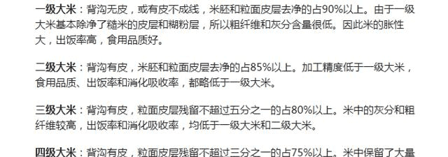 大米的国家标准中,把大米的品质分为4个等级,分别是:一等、二等、三等、四等(下图)。对于咱们来说,看懂这个比较费劲,而且对买大米没有实际参考意义,简单了解一下就行。具体买大米时,咱们只需要看一看包装上的执行标准就可以了。