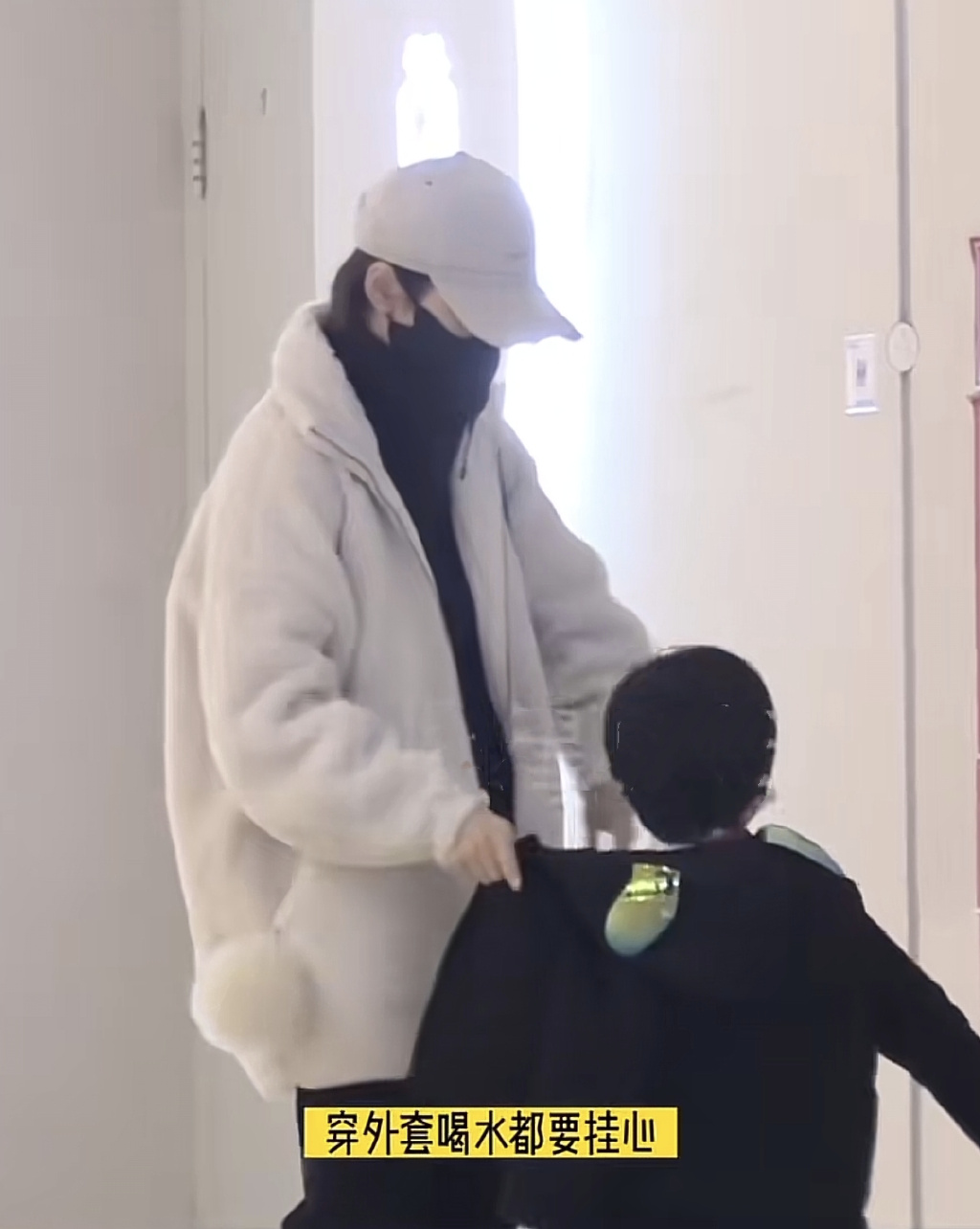 谢楠担心儿子会冻着,给他把衣服穿上保暖,又让儿子喝了口水,照顾得无微不至。
