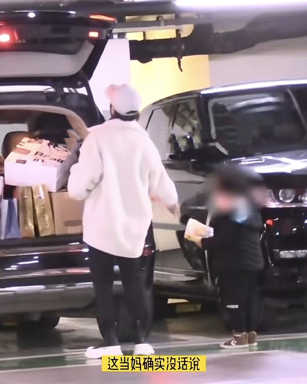 找到自己的车后,谢楠打开了后备箱,从里面拿出了一个玩具递给儿子。