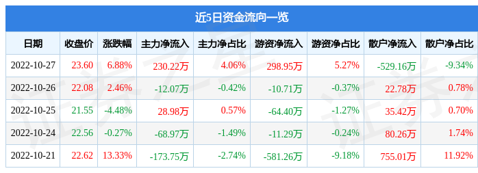 资金流向数据方面,10月27日主力资金净流入230.22万元,游资资金净流入298.95万元,散户资金净流出529.16万元。