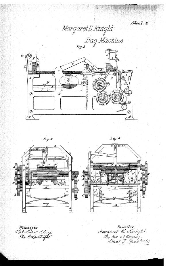 此后十几年间,人类一直在对这类机器的改进上穷折腾而徒劳无功。直到 1871 年,一位 33 岁的女性玛格丽特·E.奈特才快刀破腐,推出了一台可制作平底纸袋的机器。
