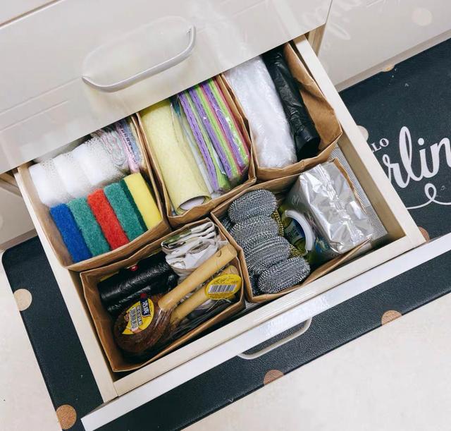 它的作用,相当于一个大号的抽屉分隔收纳盒,兼具分类和竖放优点,可以将抽屉内空间最大化的利用。即使放满,也能一目了然,抽屉又能保证快速拿取,牛皮纸的形状还会随着收纳物品而改变,超级灵活,比塑料收纳盒更有优势。