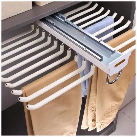 伸缩裤架,适合衣通做少了的用户。利用这个裤架,就可以把横向排列的裤子改成纵向排列,说白了就是扩充点衣柜里的空间。拿取肯定是不方便的,但也是无奈之举了。