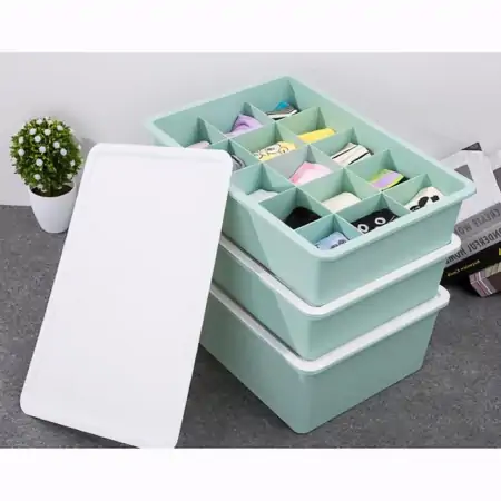 分格收纳盒,是当年比较火的所谓“收纳神器”,用来收纳内衣袜子的。不过这个盒子只能叠放,使用下面的盒子时,需要抬起上面的盒子。这样看来,远没有抽屉式的收纳工具好用。