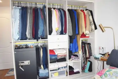 衣柜由于收纳空间的高度足够,所以很多时候我们除了要让底部变得更整齐以外,还可以想办法开发高处的空间。悬挂式收纳工具,就是这种目的。
