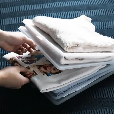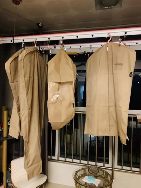 防尘袋,类似于编织袋,但是不透气。也有一些防尘袋是直接套在衣架上的,这样的防尘袋就不再是收纳工具,而仅仅是为了防尘了。