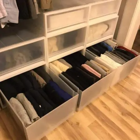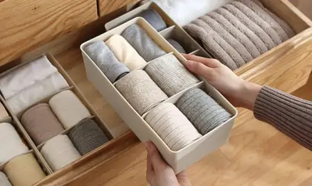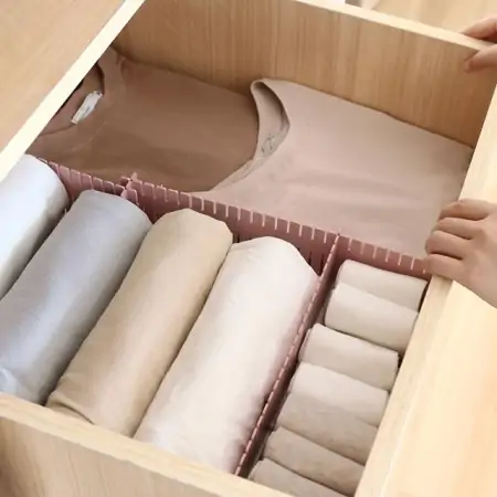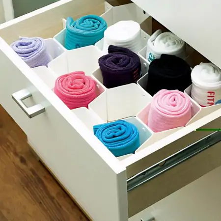 蜂窝隔板,通过塑料隔板把抽屉内部空间分隔成蜂窝状。缺点就是每一个部分的尺寸都是一样的,收纳内裤袜子等尺寸统一的东西还好,否则很容易出现大件放不下、小件放不满的问题。
