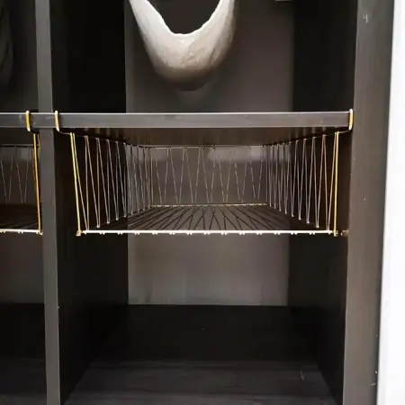 下挂篮层,就是挂在衣柜上面那个层板的底部,下面垂着一个篮子。这个东西一定要慎用,或者用的时候不要放重物。反正我家用这个半年,悬挂的层板就变弯了。