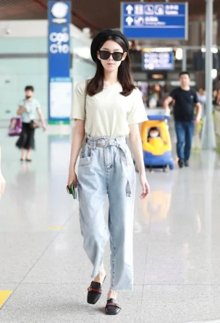 九分纸袋裤,指的就是九分的宽松高腰裤。这种裤子的长度一般停留在脚踝上,穿起来的效果和其他裤子相比更能显瘦显高。像图中演员李冰冰这条,就算是九分纸袋裤中风格比较时髦多样的了。她这条九分牛仔纸袋裤不仅有花苞样式的边边,而且腰带的设计更能显出她纤细的腰条,穿起来的感觉又显瘦又显高,再搭配上一件清凉吊带背心,像极了现在流行的“女团风”服装。