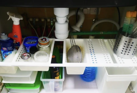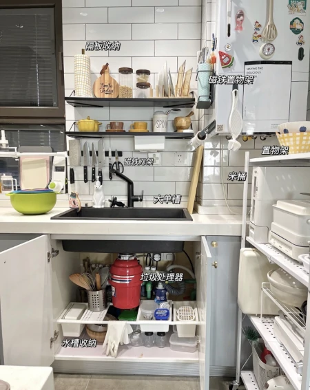柜内收纳,屋主也进行了一个位置上的区分,比如吊柜和水槽柜内,收纳的物品也是完全不同的。