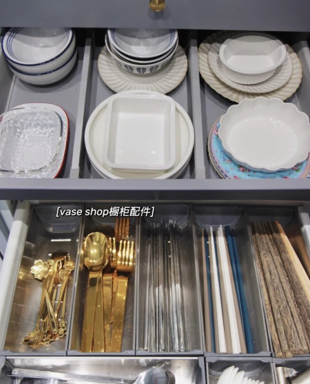 不管是餐盘放置还是餐具收纳,全都用分隔收纳盒,这样每次打开就非常一目了然,拿取也会轻松很多。