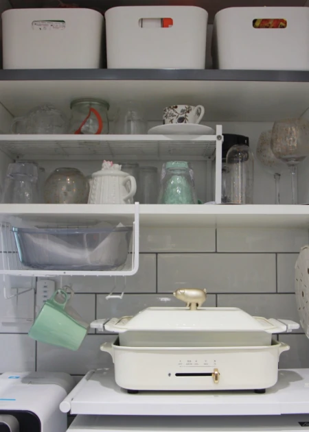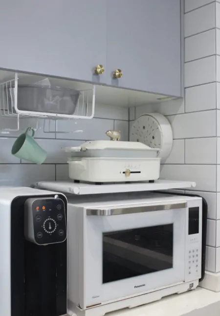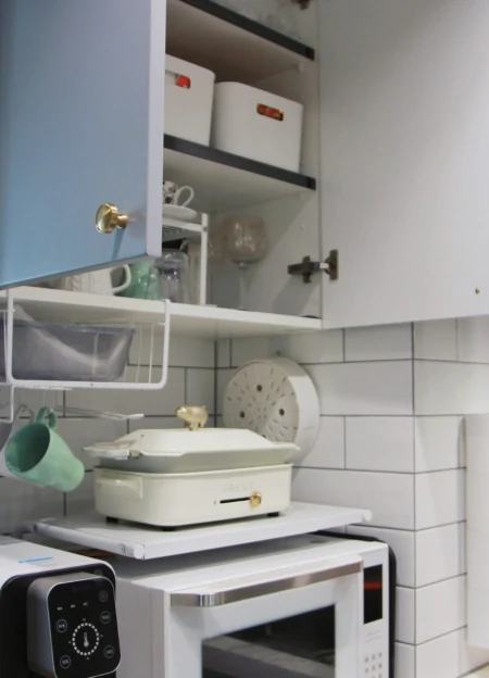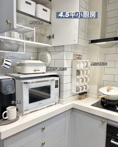 台面收纳是针对使用频率高的物品,比如微波炉、多功能锅、常用杯子等等。