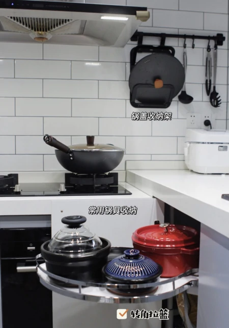 厨房拐角橱柜,是通过转角拉篮来利用柜内空间的,这样就不用每次伸半个身子进柜子里取物。拉篮轻松拉出推进,让收纳变得更轻松,简单。