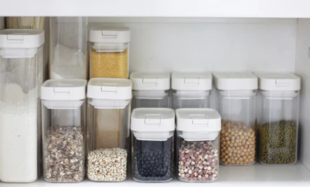 为了保证密封性和整洁度,屋主使用了透明的密封罐来收纳,这样拿取一目了然,也更能保证谷物干燥保鲜。