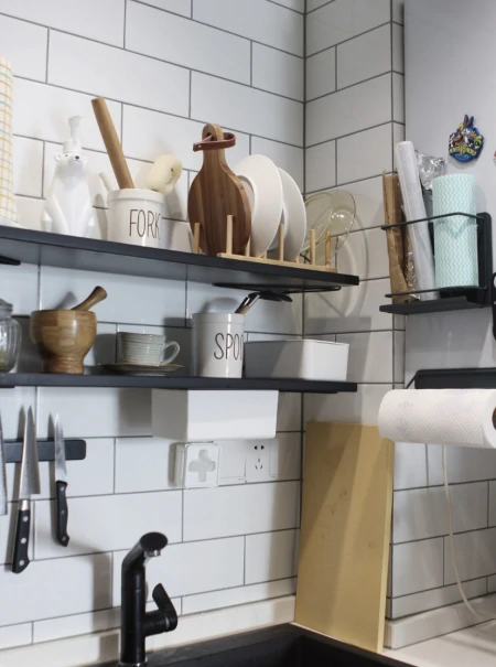 想要厨房空间利用得更好,墙面收纳也一定是少不了的,比如在水槽上方,屋主就通过双层的隔板,来收纳常用的杯子、盘子等。