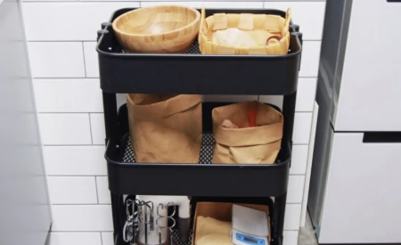 屋主还通过置物架,来补充厨房物品的收纳盒存放,一开始使用的是宜家的小推车。