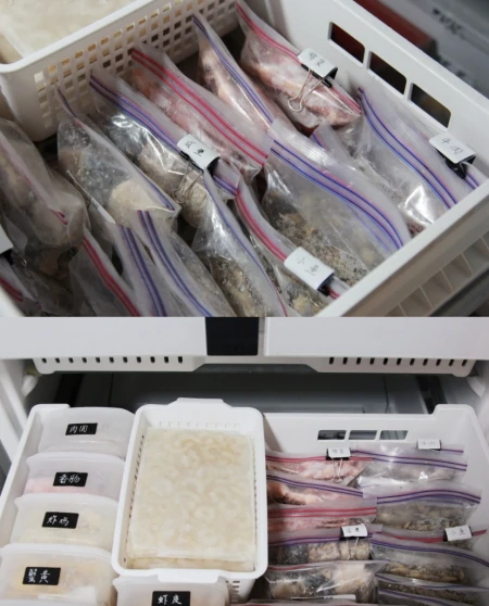 冷冻区更多是用食品塑封袋来分来收纳肉类,这种方式能减少占用空间,每一袋存储一顿的量,解冻后也更方便。