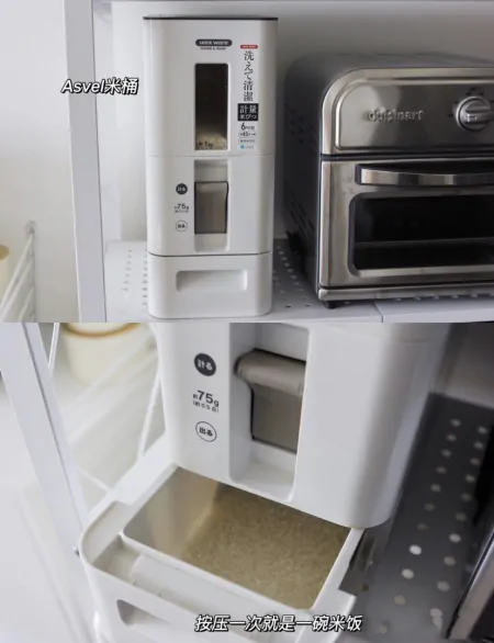 米箱很适合放在台面或者置物架上,按压出米,取米比较轻松。每按压一次,就是一碗米饭的量,这样煮饭更能做到心中有数。