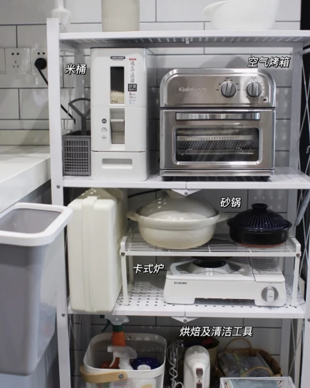 一个置物架,就把小烤箱、米箱、卡式炉、各种锅和清洁剂、烘焙工具等,全收纳完了。