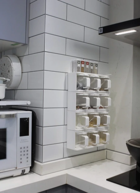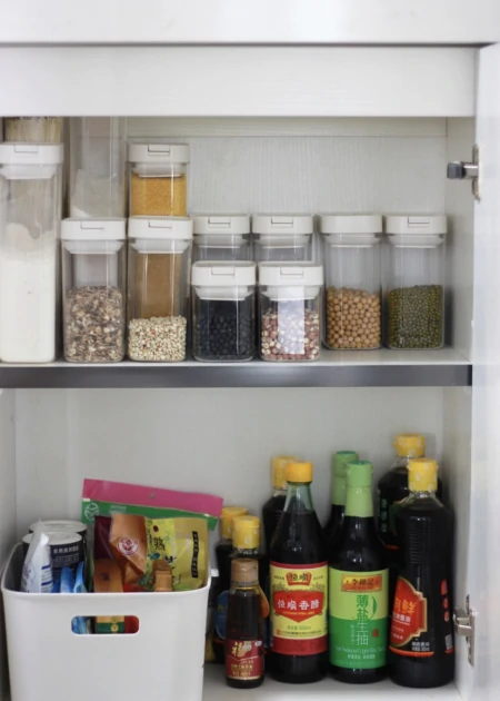 一些存储的零食和调味品,也可以收纳在柜内,减少台面上的物品摆放。
