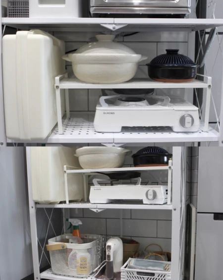 下层通过一个分层架,来分层收纳卡式炉和砂锅,这样拿取也比放在柜内方便。