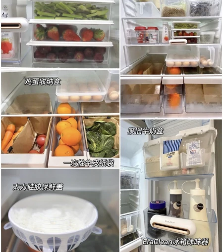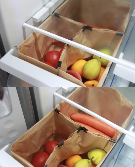 先是冷藏区,主要用收纳盒和保鲜盒和一次性牛皮纸袋,来分类存放不同的果蔬。