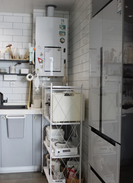 不过随着常用家电的增多,又把小推车更换成多层置物架,收纳的物品更多,空间利用率更高。
