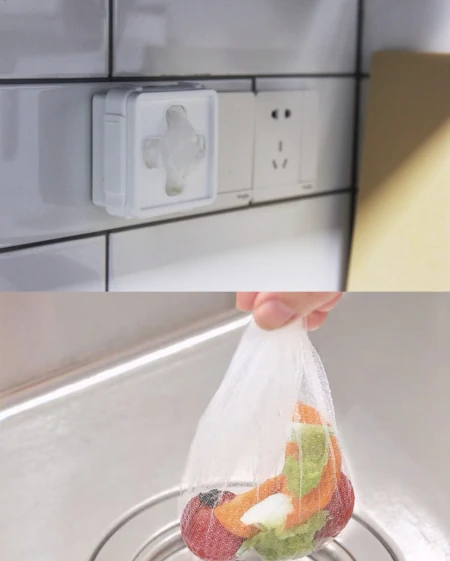 纸巾盒下方墙面,还壁挂了一个小小的十字收纳盒,是收纳水槽过滤网。
