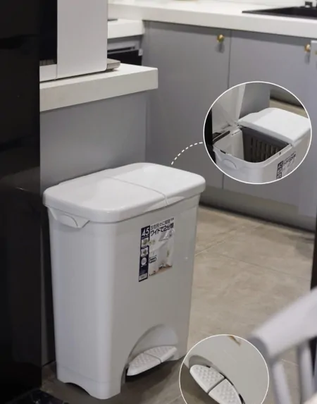 最后我们还看到屋主家靠近厨房门的位置,放了一个日式分类垃圾桶,一个它,也解决了干湿垃圾的分类存放的问题。