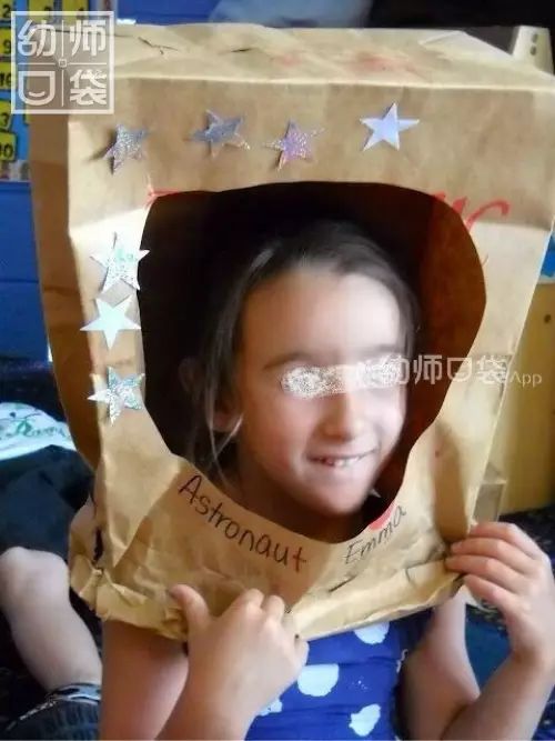 1b+老师说:牛皮纸袋、纸盘子上挖个洞,贴上透明塑料纸,装饰一些小星星就是一个头饰啦:变身宇航员!角色游戏的时候,我们也可以用简单的材料做个航天站了。