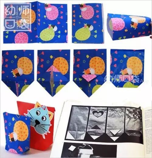1b+老师说:选取多个同样大小的纸袋,对折后贴上贴画,可以是一个故事、可以是一个系列的照片等,再用绳子穿起来。纸袋里还可以放一些小卡片,给图书多一份惊喜哦!