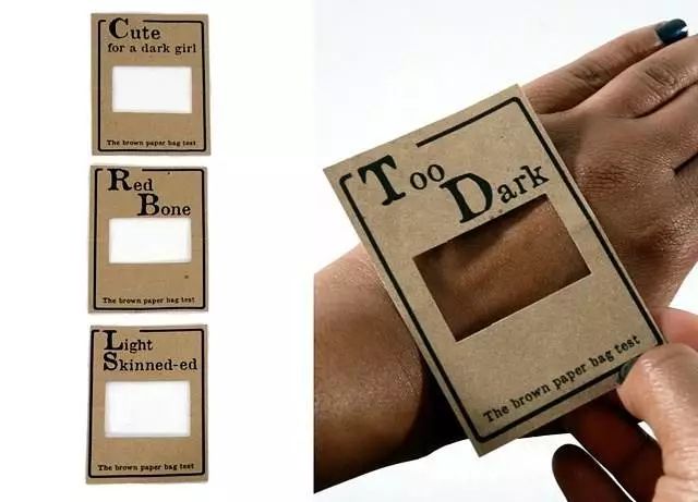 当它遍布美国大街小巷时,奴隶制早已宣布被废,但种族歧视却进化成了变异病毒,潜进了美国各个阶层。不知从何时起,包括教会、妇女联谊会、兄弟会等在内的、黑人社区的各组织开始用牛皮纸袋(或其他棕色纸袋)来测试申请人,如果申请人的肤色浅于纸袋的颜色,则会被认为素质更优,从而能获得入会资格;反之,则会被拒之门外,或者最起码,也得坐到组织的后排。这,就是曾经大名鼎鼎的“纸袋测试”(brown paper bag test)。