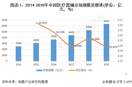 据前瞻产业研究院报告指出,受益于经济水平的发展,健康需求不断增加,中国医疗器械市场迎来巨大的发展机遇。《中国医疗器械蓝皮书2020》数据显示,2019年我国医疗器械市场规模约为6341亿元,同比增长19.55%。