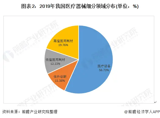 国内医疗器械各子行业市场占比情况与全球市场大体类似。2019年,医疗设备子行业拥有过半的市场份额,占比为56.79%;其次是高值医用耗材子行业,市场份额为19.78%;紧接着是低值医用耗材,市场份额为12.14%;占比最小的是体外诊断子行业,占据11.39%的市场份额。