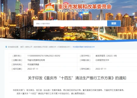 7月11日,重庆市发展和改革委员会发布关于印发《重庆市“十四五”清洁生产推行工作方案》的通知。