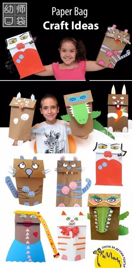 1b+老师说:纸袋除了翻转底部来制作动物,还可以做出饱满可爱的小动物,将纸袋塞满,中间扎一下,超立体的小狗、麋鹿、小鱼就出现啦。动物主题再不怕材料单一了!
