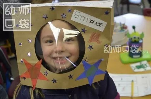 1b+老师说:牛皮纸袋、纸盘子上挖个洞,贴上透明塑料纸,装饰一些小星星就是一个头饰啦:变身宇航员!角色游戏的时候,我们也可以用简单的材料做个航天站了。