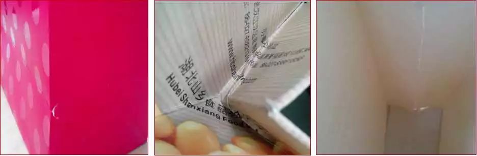 手提袋及类似工艺用纸说明 1、手提袋及类似工艺:凡在成型中出现双层或多层纸张正反折,多条压痕线交集的米字型区域的工艺,对纸 张耐折的要求比普通包装盒要高,建议归类在手提袋用途; 2、纸种选择:在APP工业用纸所有纸种中,只有金丽 IVS 手提袋专用纸定位为手提袋用途,其余纸种均不接受手提袋爆裂类客诉; 3、高克重纸张:由于单面涂布白卡纸张,相较于其它手提袋纸种,挺度更好,在使用高克重(250克及以上 克重)纸张制作手提袋时,应更多的关注工艺细节,以防止出现爆裂问题。 不同纸质手提袋及其特点 白牛皮手提袋 黄牛皮手提袋 牛皮纸类:性价比高,强度好,但印刷及成型效果一般,常用于大众快消类产品 铜版纸手提袋 特种纸手提袋 白卡纸手提袋 白卡纸类:印刷效果好,挺度高,成型效果优异,常用于食品、化妆品、电子产品、房地产展示类产品; 白板/灰板类:印刷及成型效果好,性价比高,常用于食品、电子产品、服装类产品; 铜版纸类:印刷效果优异,适合双面印刷,成型效果好,常用于高档服装、儿童用品等产品,外销较多; 特种纸类:纸张面感好,艺术感强,常用于高档文创、礼品、服装类产品。 手提袋制作流程图 1 2 3 6 5 4 手提袋为什么容易爆裂 手提袋爆裂常见原因分析 爆裂原因: 1、工艺因素:模切不规范;手工力度大;不覆膜;超高克重;UV温度高、压纹过深;低温低湿。 2、材料因素:纸张耐折度低;膜的质量不好;压痕刀板压痕条问题。 非覆膜类产品风险提示:手提袋覆膜与不覆膜,其制作时对纸张的耐折要求存在很大差异性。单面涂布白卡纸有着更好的挺度,在制作非覆膜类产品时,必须评估工艺环境及爆裂风险,建议全工序打样确认使用效果。并在大货生产时严格参照打样参数。 手提袋容易爆裂的关键位置 常见手提袋爆裂位置--多层折叠区域 多层折叠部分爆裂,一般在成袋时就已经表现出来。 造成爆裂的原因: ①纸张厚挺度大,耐折度偏低,环境温湿度过低,未覆膜; ②压痕线不规范,多张模切; ③成袋手法不规范,压痕线对不齐,折线时力度太大 常见手提袋爆裂位置--侧角及内侧反折线 侧角与内侧反折线(米字型区域)部分的爆裂,一般在撑开造成爆裂的原因: ①纸张厚挺度高,耐折度偏低,环境温湿度过低,未覆膜; ②压痕线不规范,多张模切,袋型侧面宽不易打开; ③成袋手法不规范,撑开时动作不规范。 下一期:手提袋制作爆裂问题的改善措施,敬请期待! 欢迎关注“APP工业用纸”微信公众号