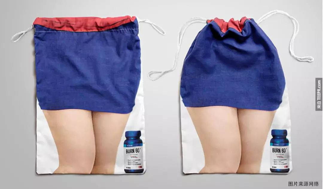 下面是正常的袋子,图案上是一条女生的短裙,但是绳子部分特别有创意,是一条裤腰带,提东西的时候,裤腰带就勒紧了,腰变细了,相当于把减肥药的药效完全直观的展现在消费者面前。