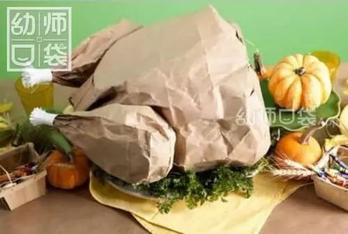 1b+老师说:牛皮纸袋做食物也是闻所未闻。准备三个纸袋,大纸袋塞满填充物并将口封好,小纸袋同样塞一些填充物,封口一把抓,用白纸包住封口,火鸡腿就做好了,将两个“火鸡腿”粘在“火鸡身体”两侧,纸袋火鸡完成啦!看着就好有食欲,放在角色区,是不是会人气爆棚?这些简单的操作,让孩子们自己游戏时候完成更有感觉哦!